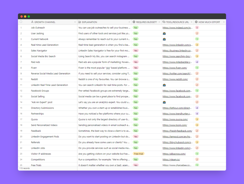 You'll get a spreadsheet of 101 sortable growth channels + strategies with added resources and links. The sheet includes 74 free strategies and 27 free trial or paid strategies.